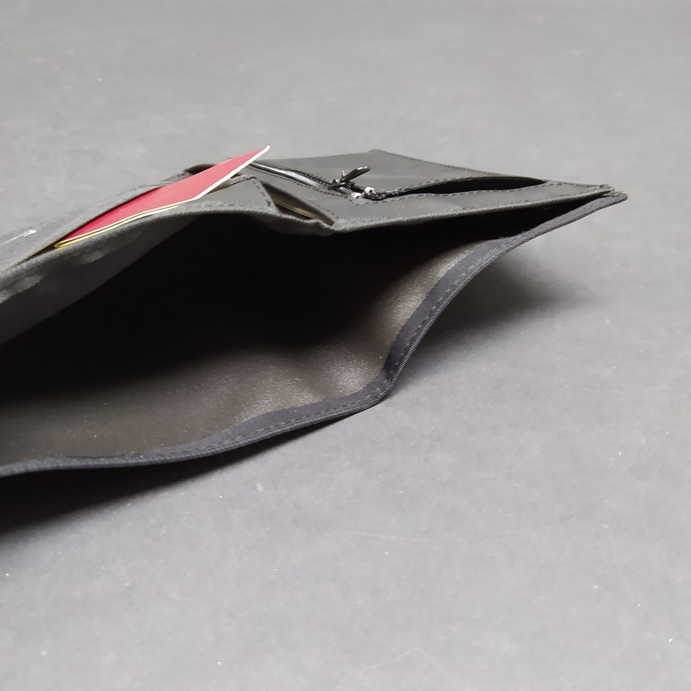 Il portafoglio è in tessuto sintetico e presenta 5 spazi per carte di credito, altri 2 spazi larghi e uno più piccolo, una tasca chiusa da zip, oltre allo spazio per le banconote lungo 21 cm. Le misure dell'accessorio da chiuso sono 11x16 cm.