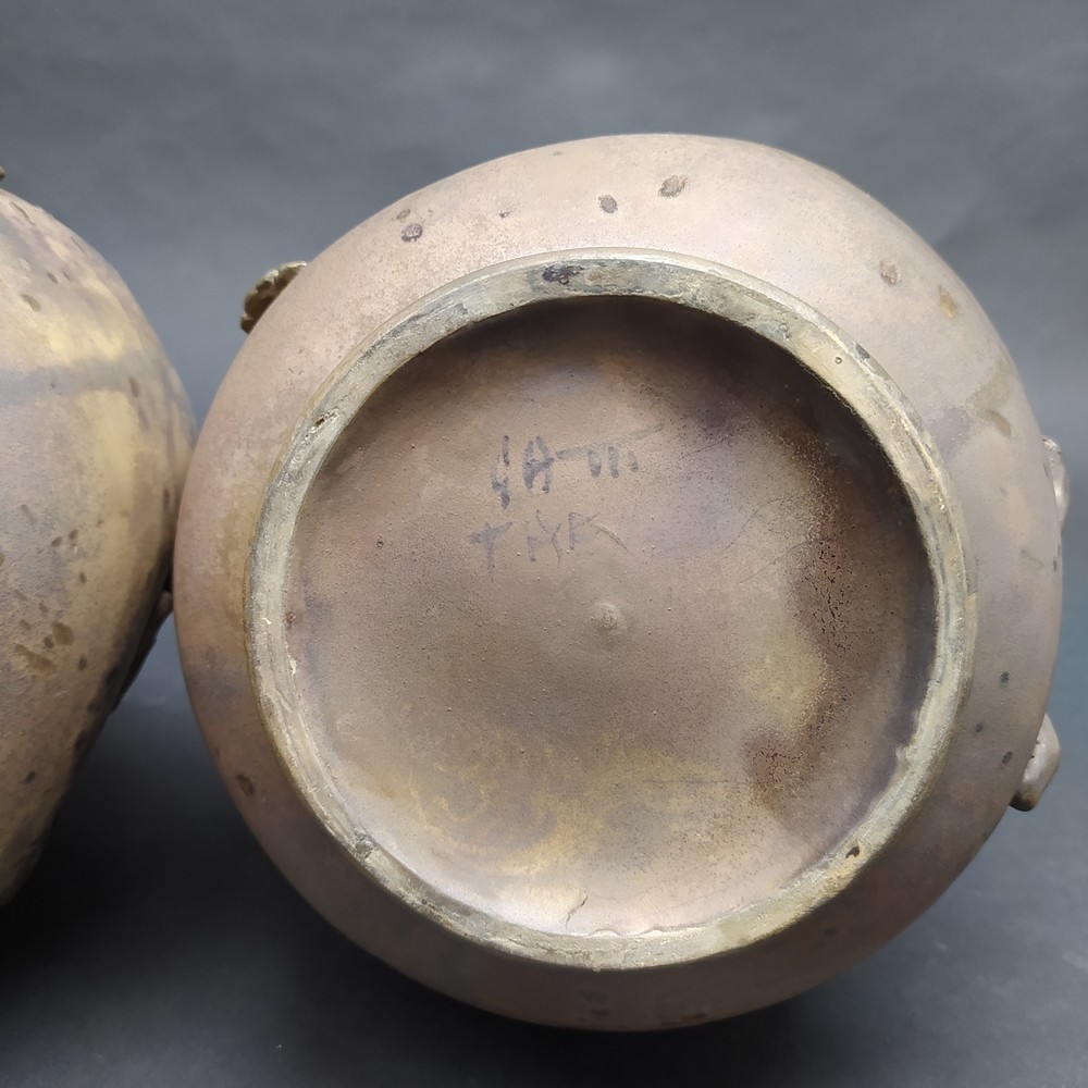 I vasi presentano corpo globulare, collo cilindrico e applicazioni plastiche a rilievo raffiguranti motivi naturalistici (foglie, pigne, uccello). La superficie è decorata con smalti metallici iridescenti, tipici della bottega Gatti.