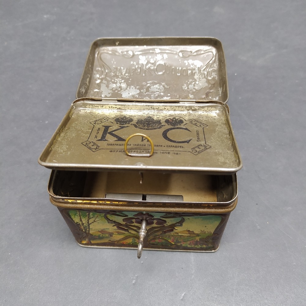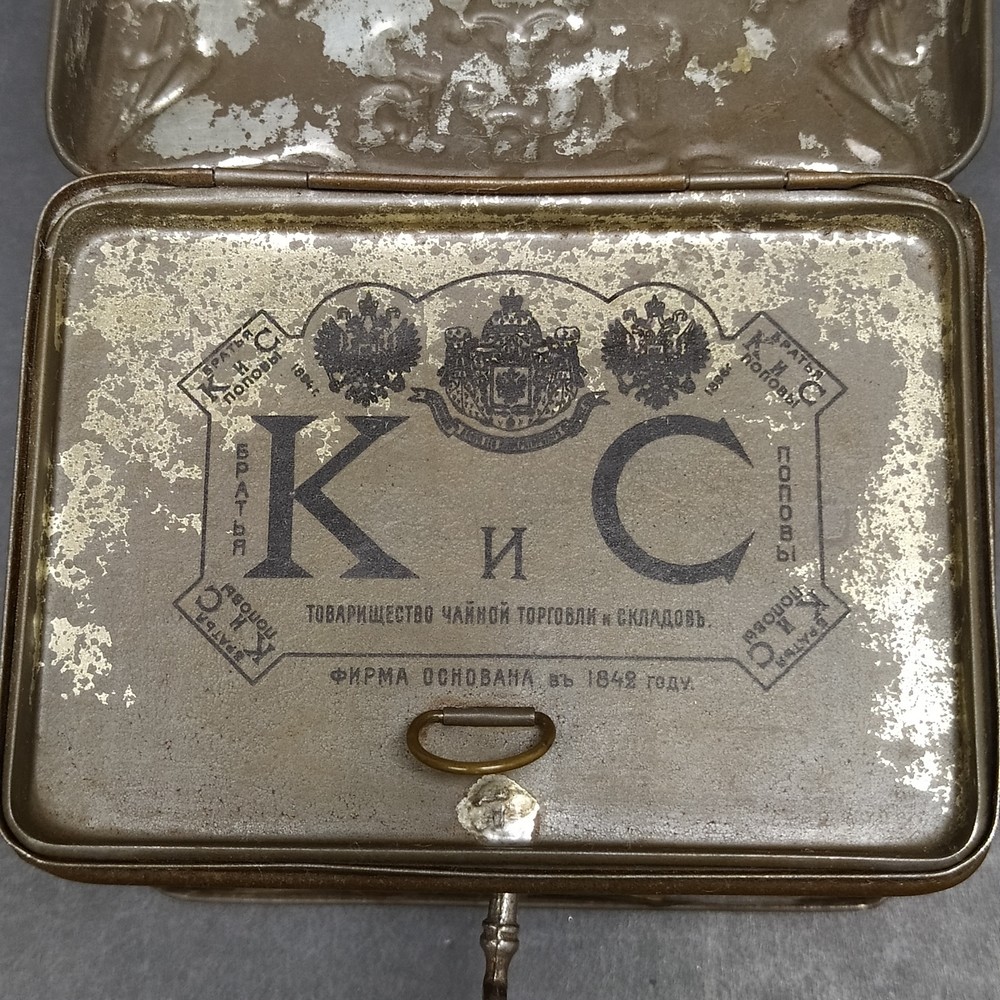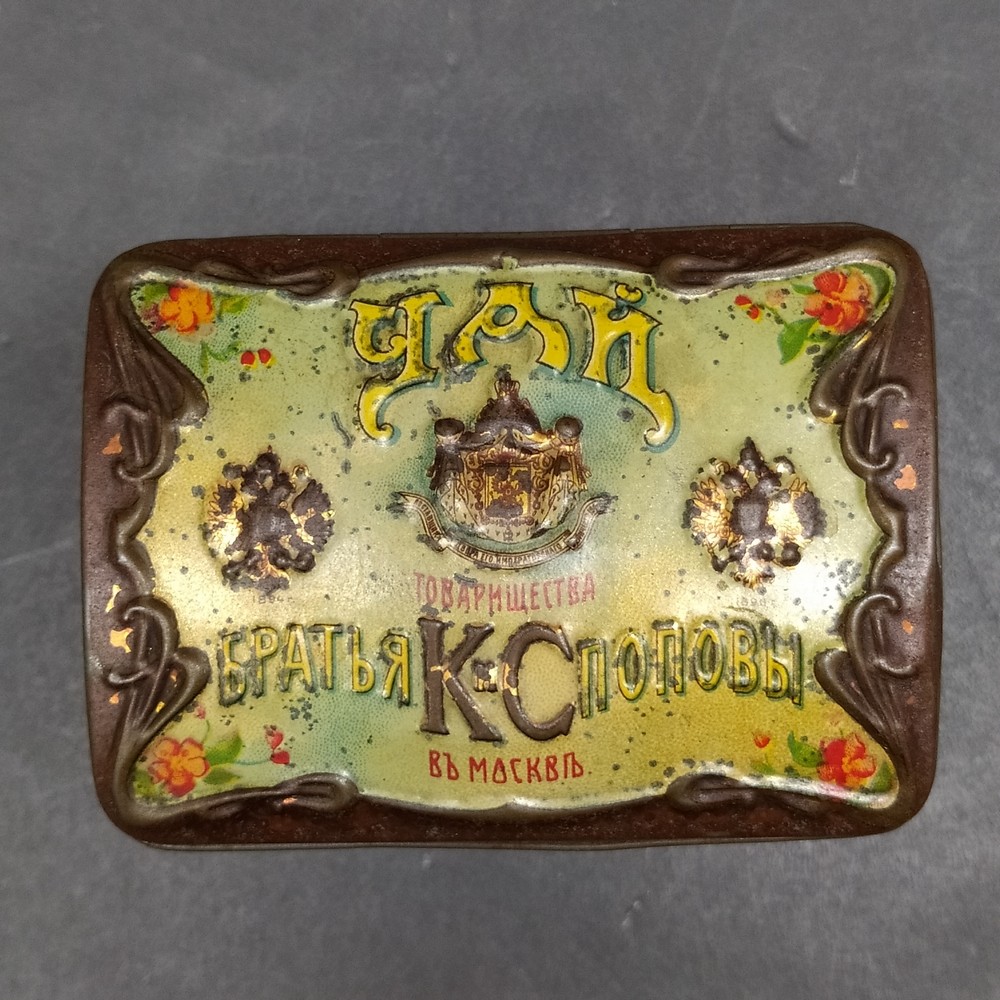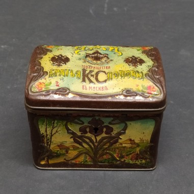 Antica scatola da tè in latta litografata, prodotta in Russia dalla celebre ditta Fratelli K.S. Popov, Mosca, attiva dal 1849.