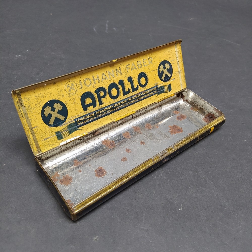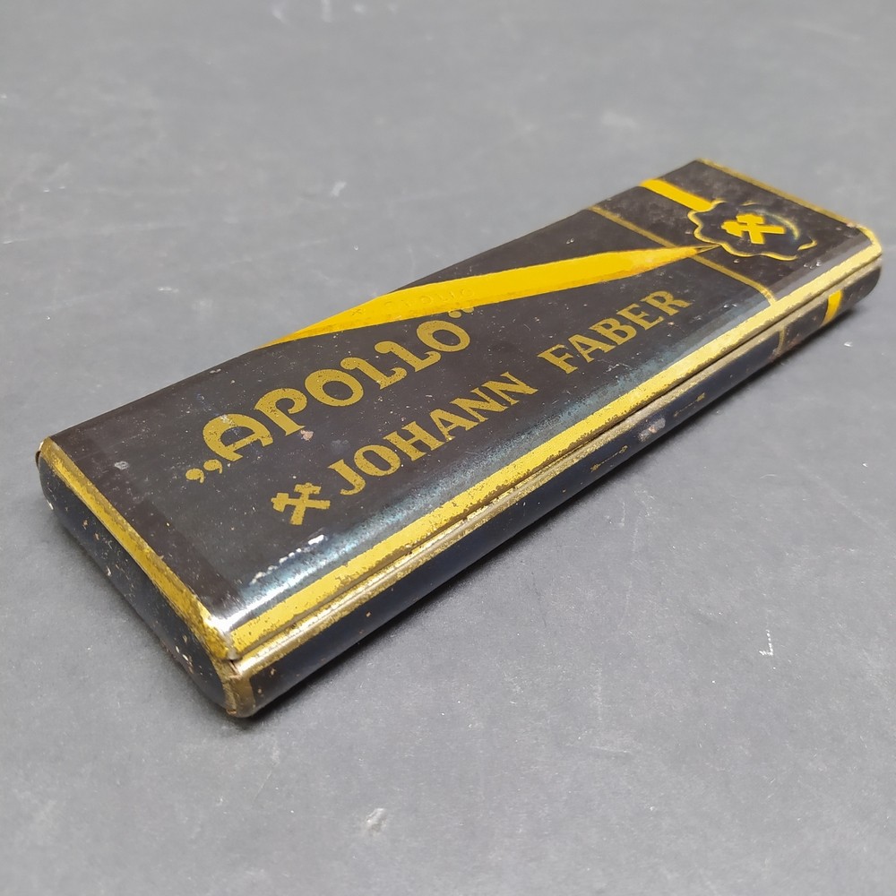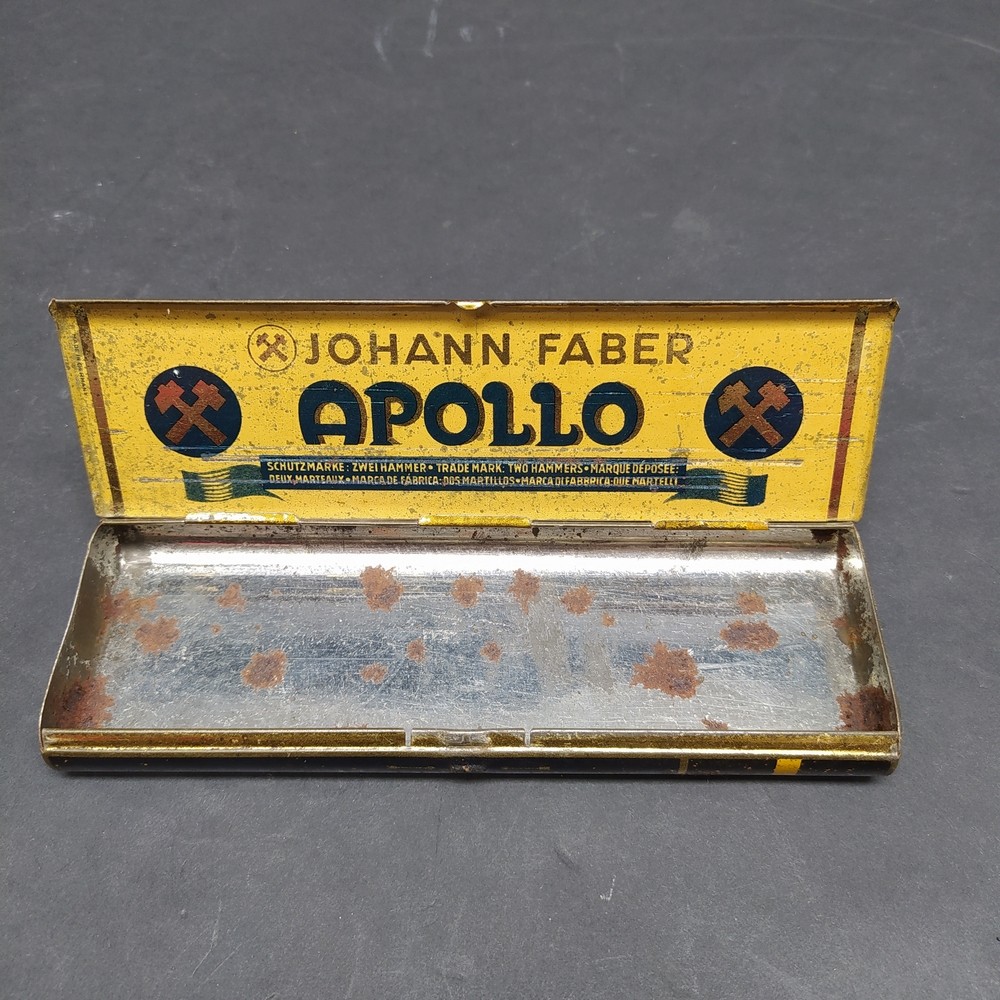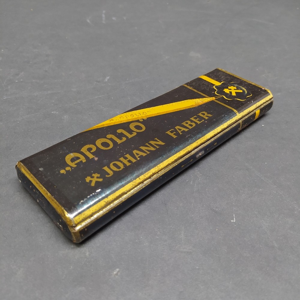 Scatola in latta originale Johann Faber modello Apollo, anni ’30-40, con grafica pubblicitaria d’epoca.