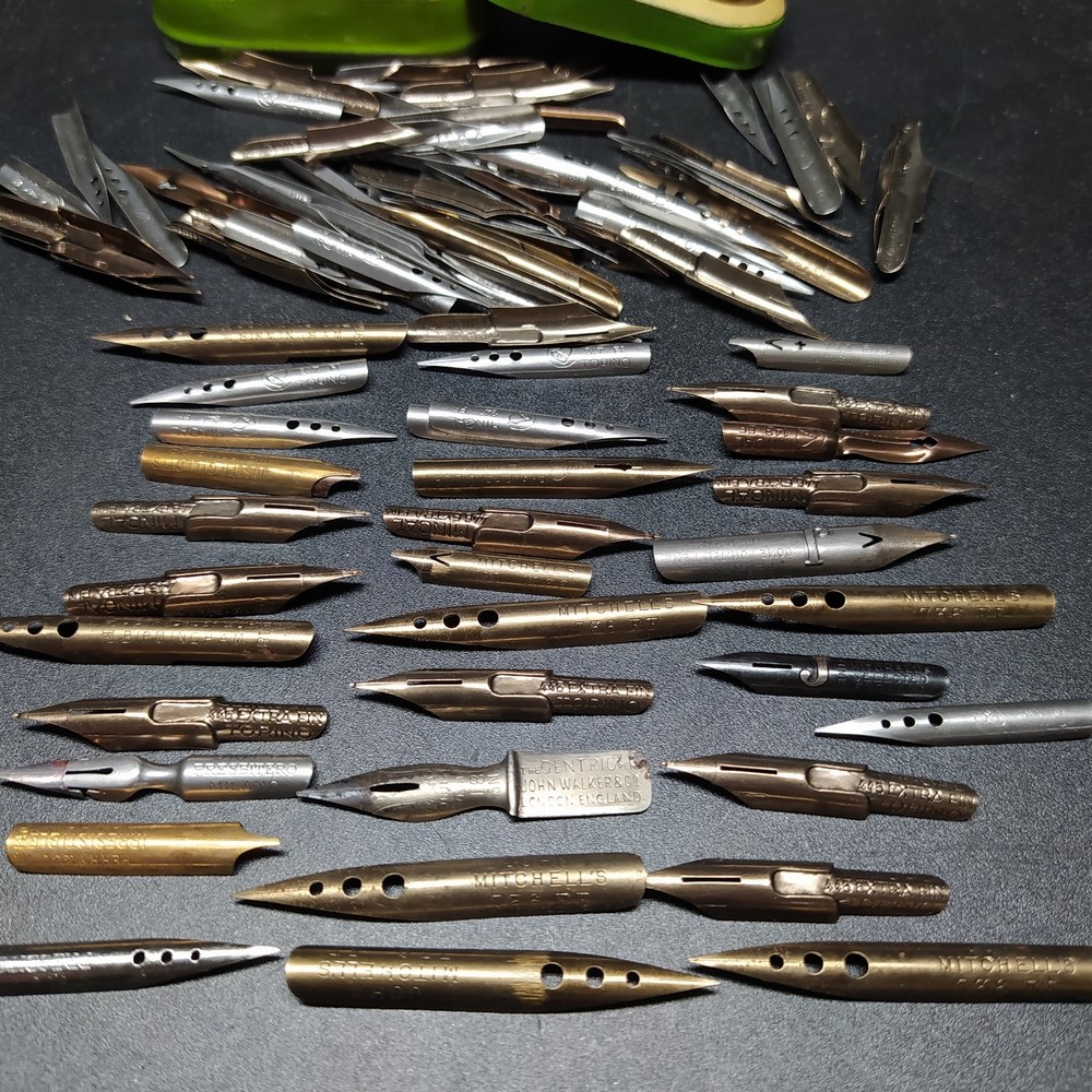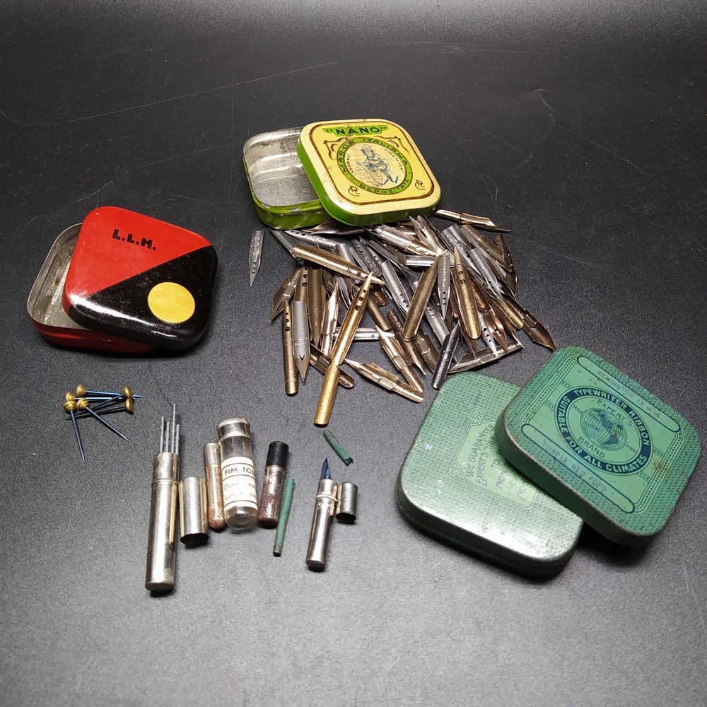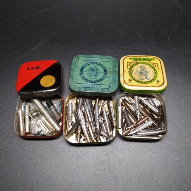 Lotto di circa 100 pennini da calligrafia e scrittura assortiti, di varie marche (tra cui Mitchell’s, John Wulker & Co. England, ecc.), custoditi in 3 scatolette pubblicitarie in latta d’epoca.