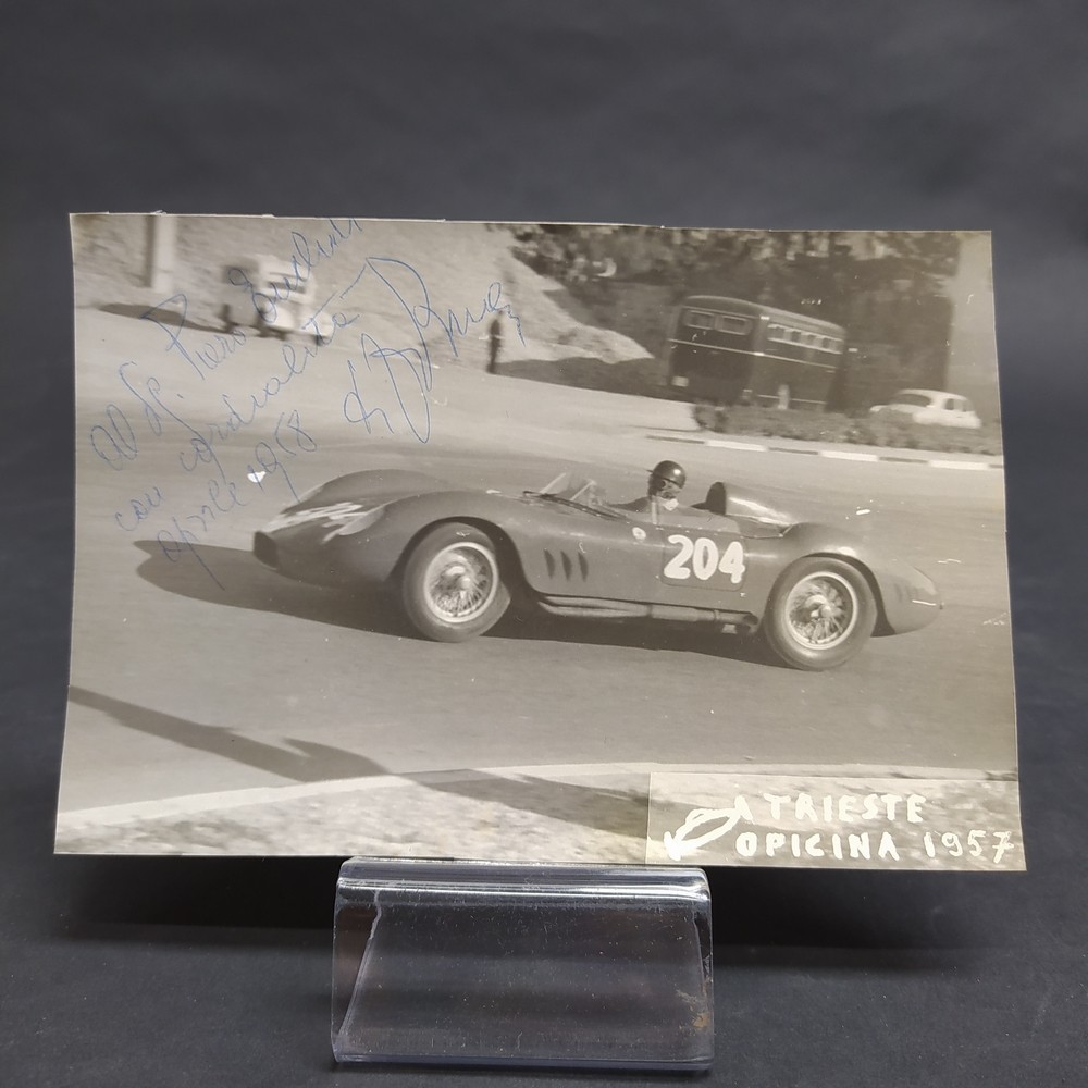 Fotografia/cartolina di un pilota di Formula 1 in formato 11x16 cm con dedica e autografo che non è stato possibile decifrare, ma è datato 1958. La vettura è una Maserati.