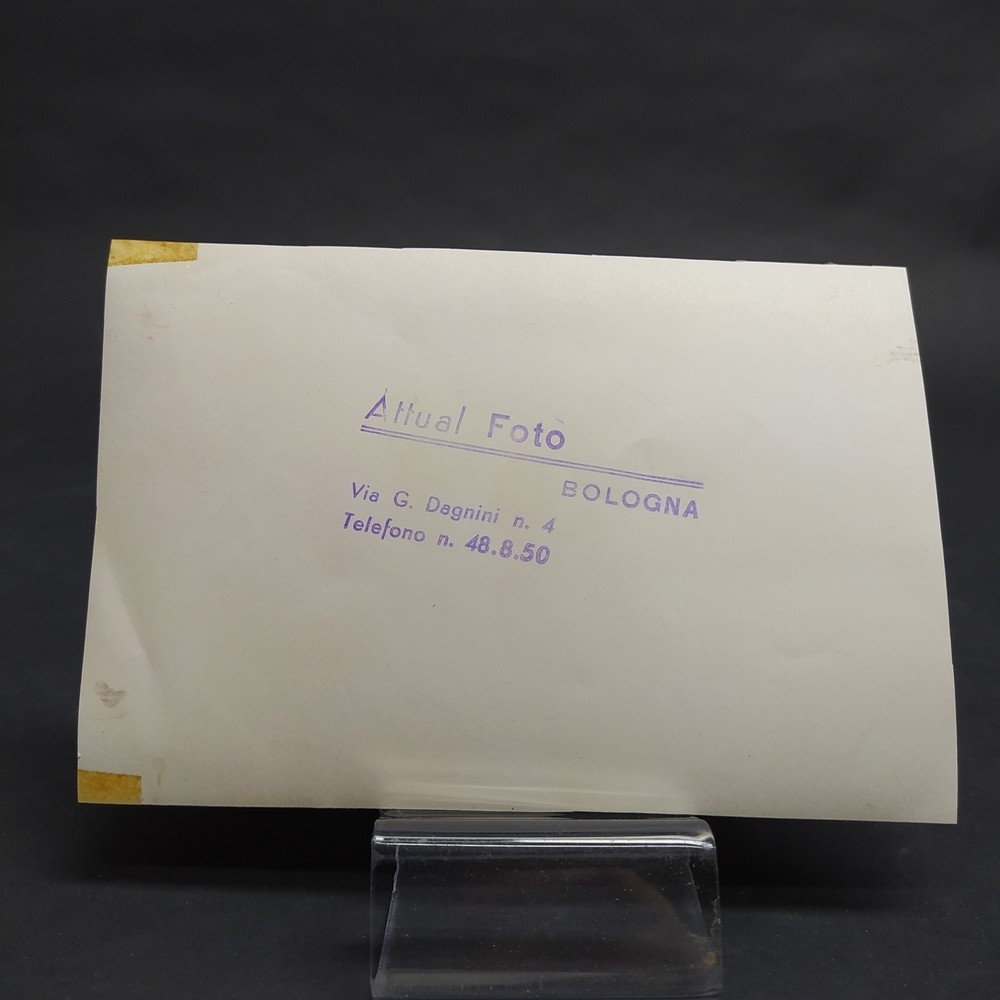 L'immagine è in condizioni discrete. Sul retro si notano segni di nastro adesivo, aloni e il timbro dello studio fotografico di Bologna.