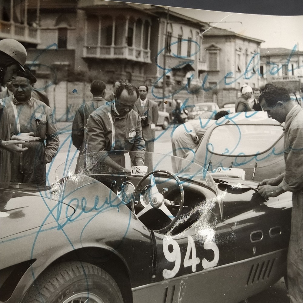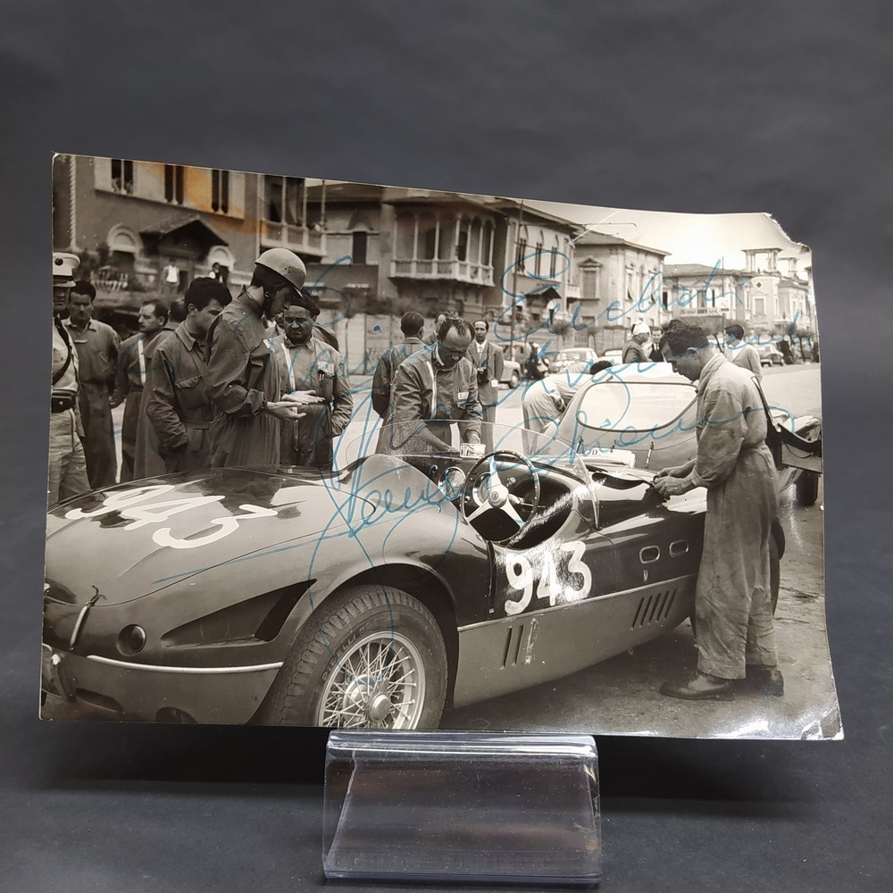 Fotografia con dimensioni 18x13 cm ritraente una Ferrari da corsa degni anni '50 con dedica e autografo non identificato.
