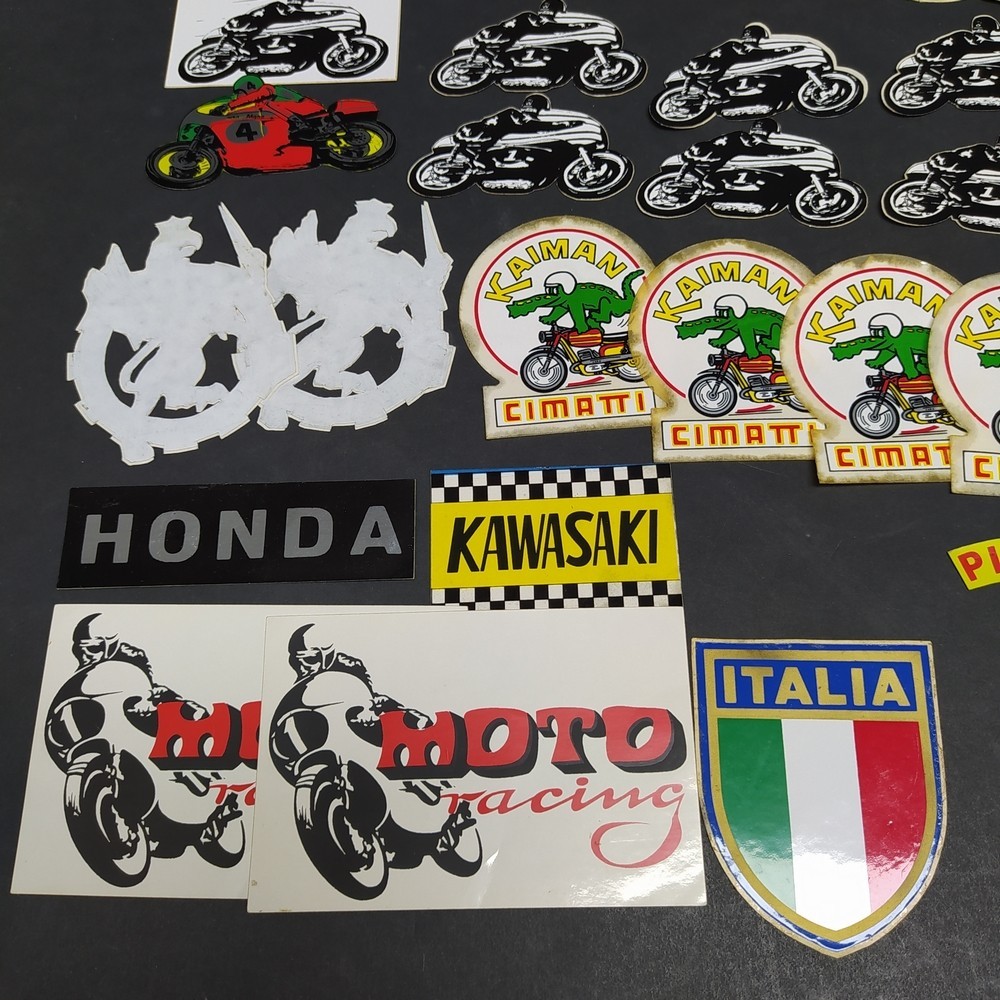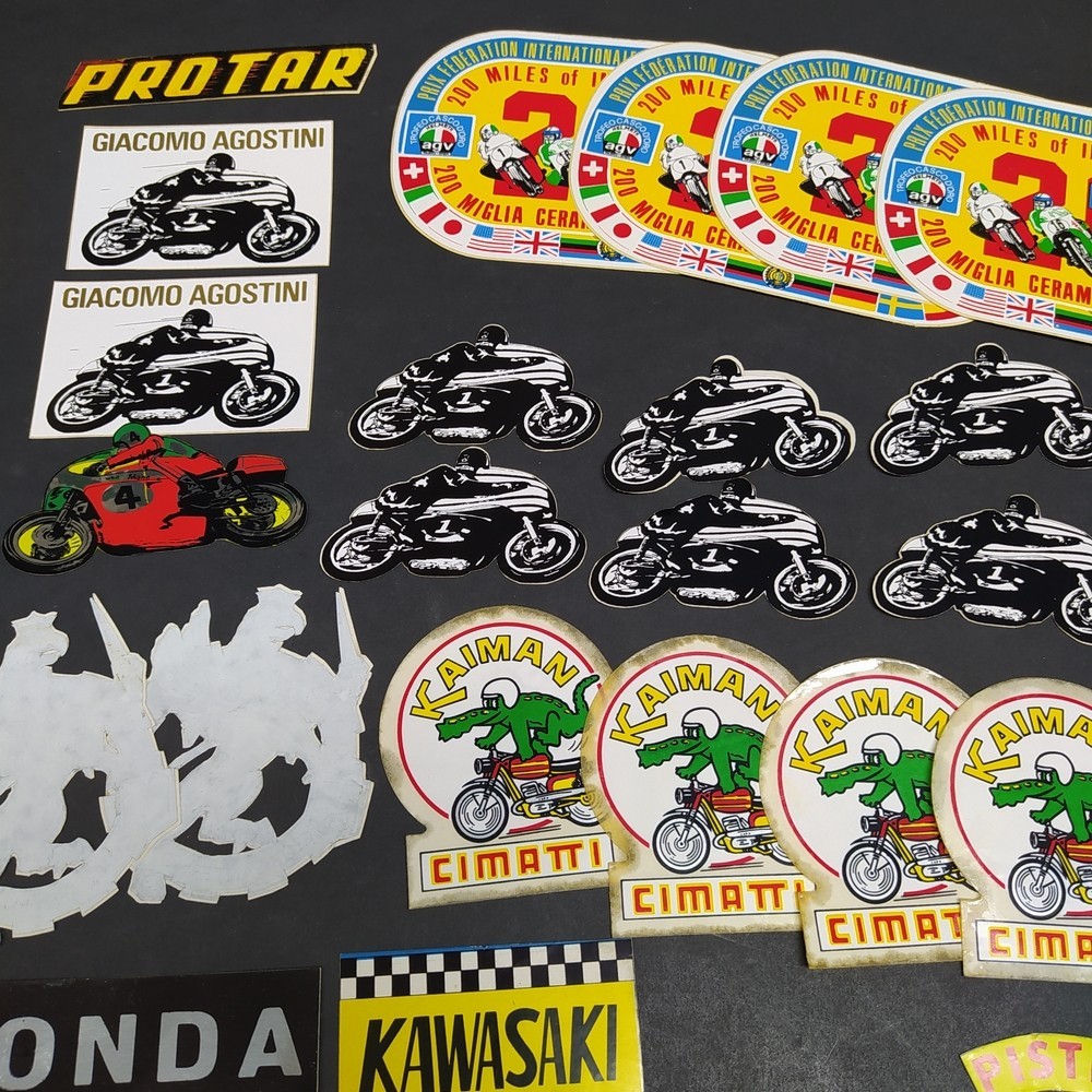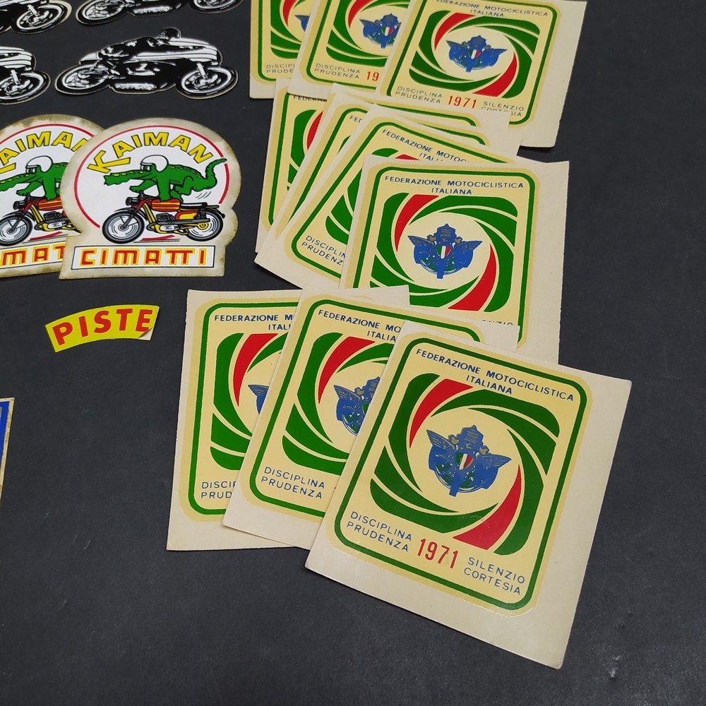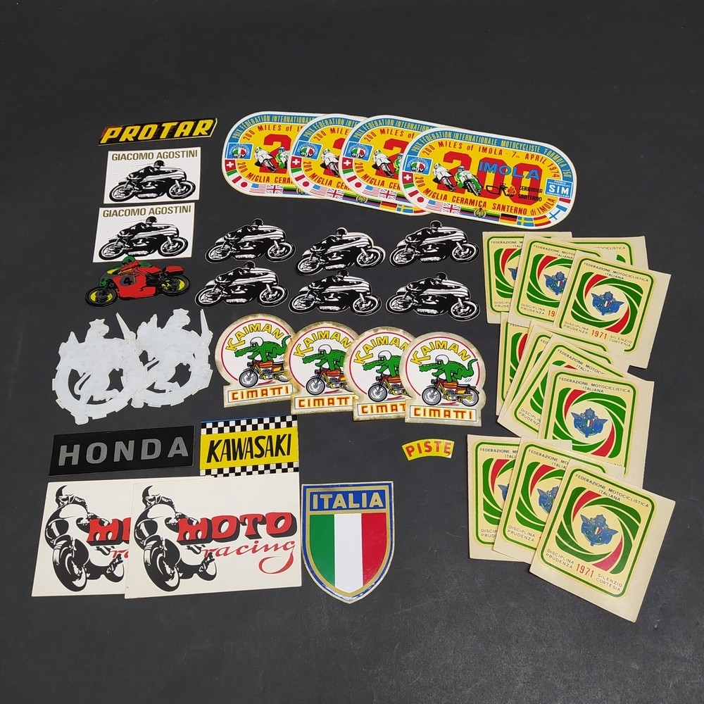 Gli adesivi riguardano vari eventi o associazioni tra cui adesivi della Federazione Motociclistica Italiana del 1971; la corsa 200 miglia ceramica Santerno di Imola del 1974 e altri generici o con nomi di marche. Di alcuni adesivi sono presenti più copie.