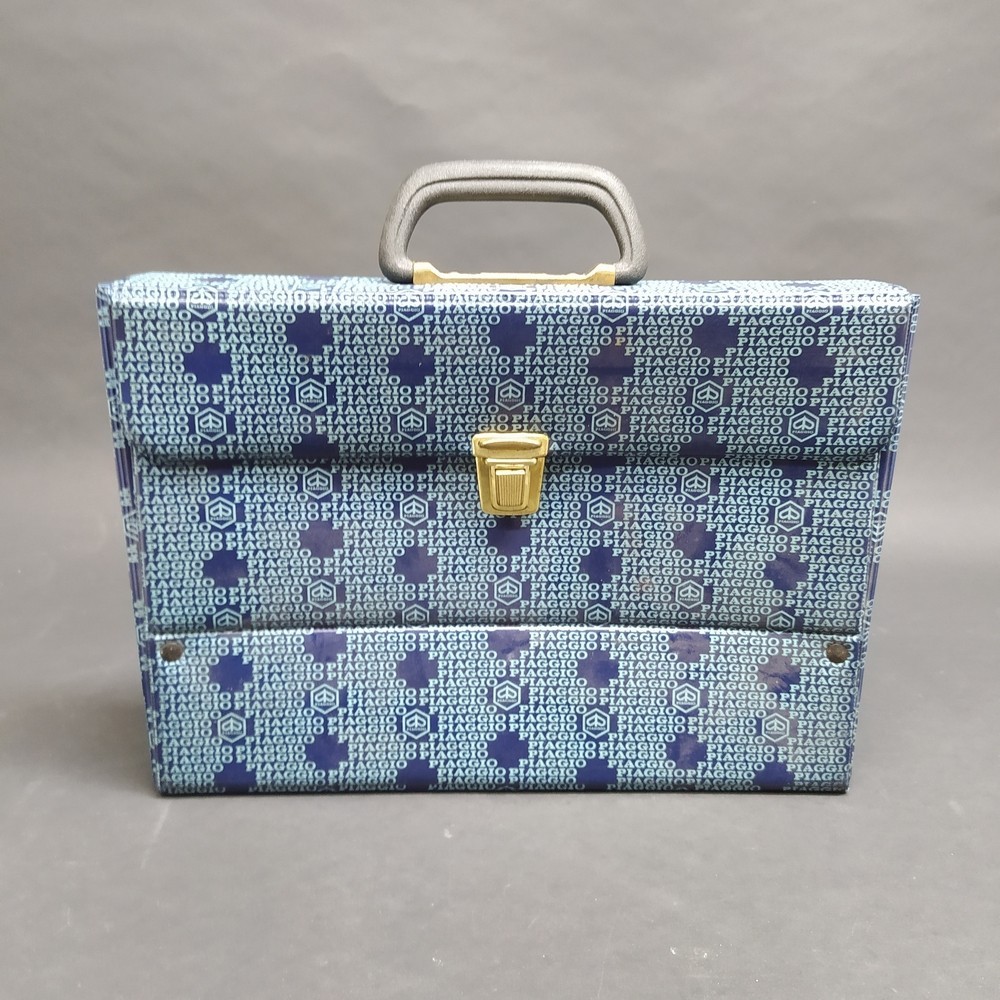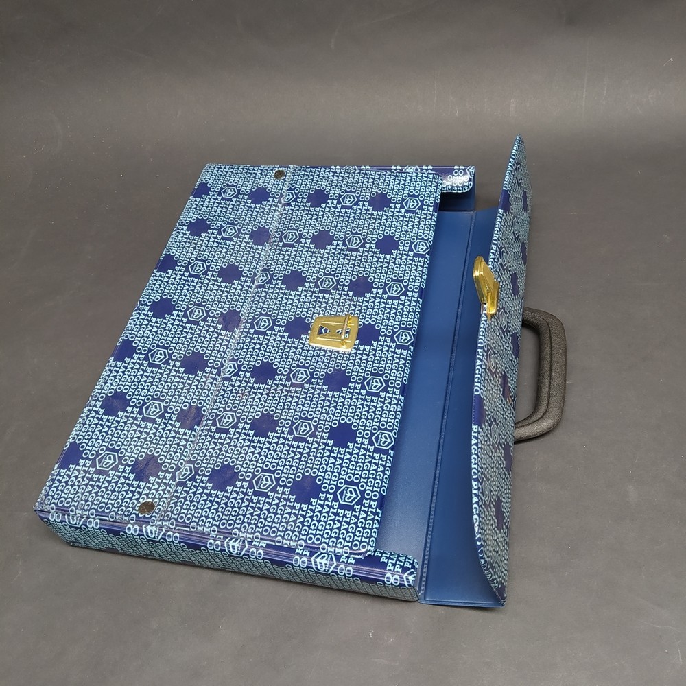 Valigetta con dimensioni 40x27 cm e spessore di 5 cm con logo Piaggio ripetuto. La cartellina è in plastica, chiusa da rivetti con maniglia e chiusura metallica dorata con segni di ossidazione.
