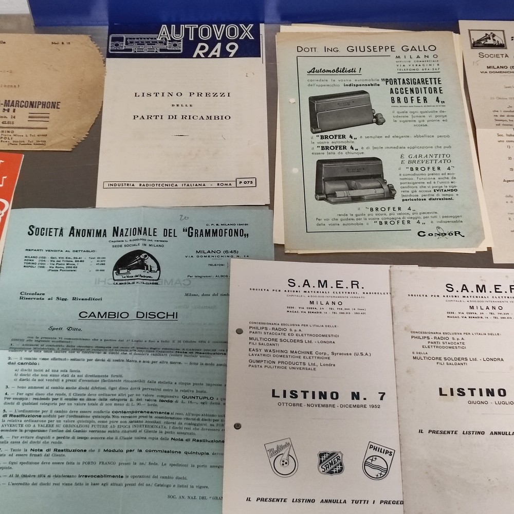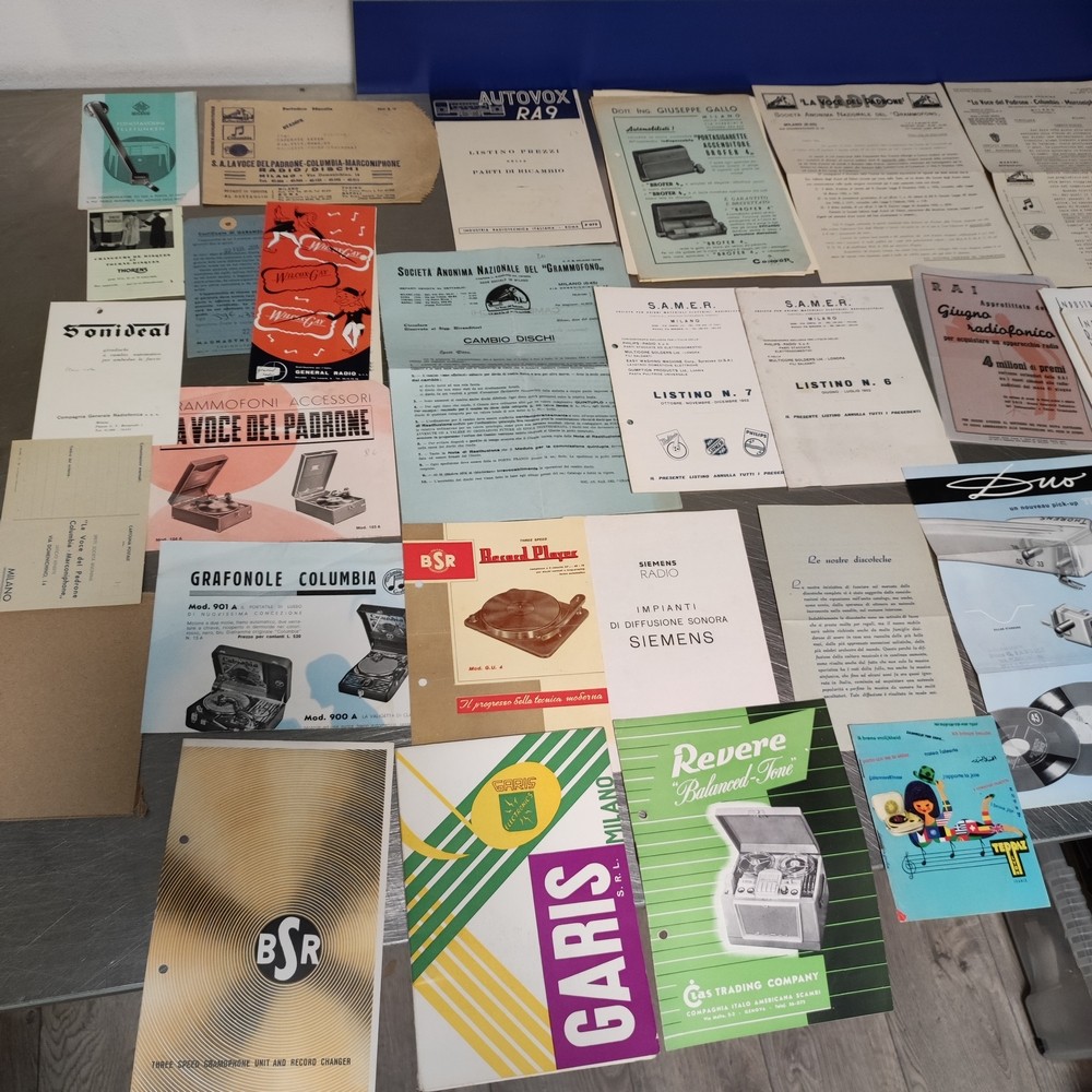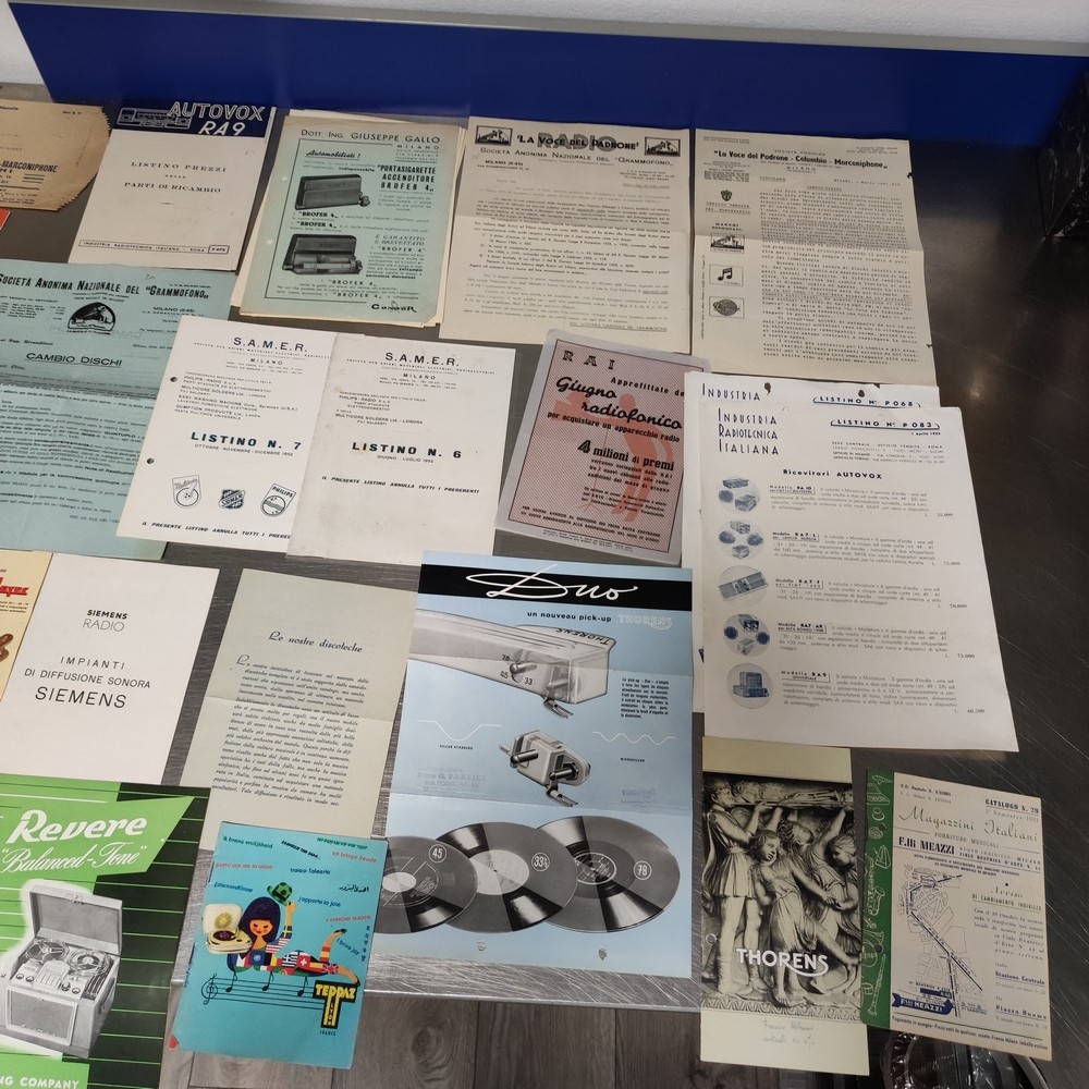 Lotto di 31 cataloghi, listini prezzi, garanzie di radio, dischi, giradischi e apparecchi audio di varie marche tra cui: