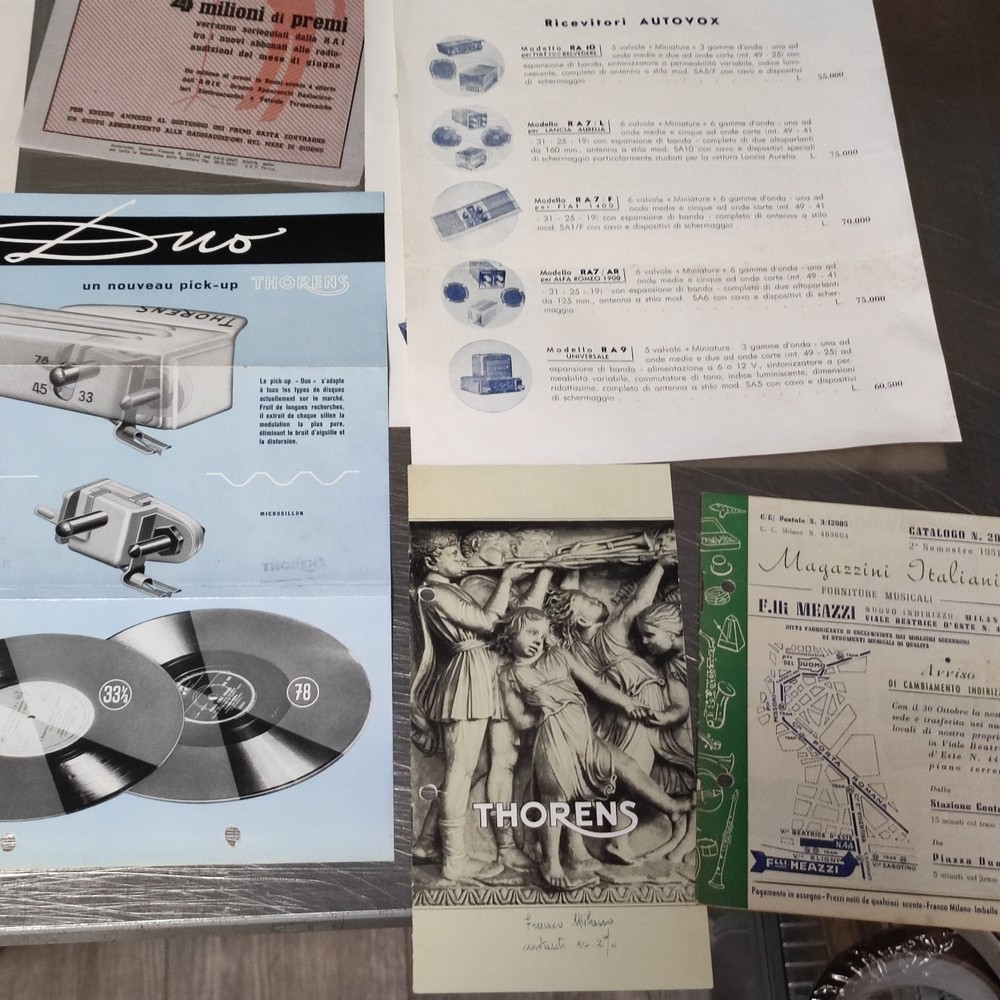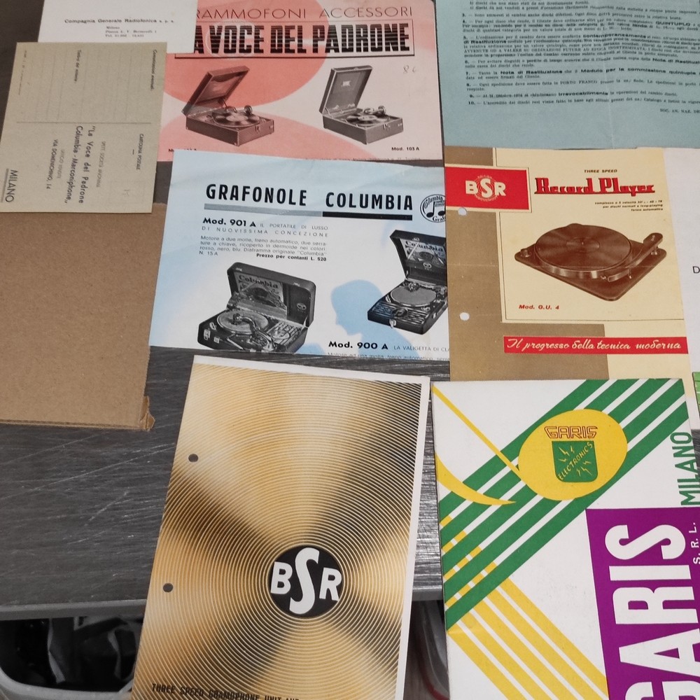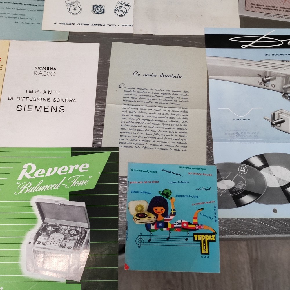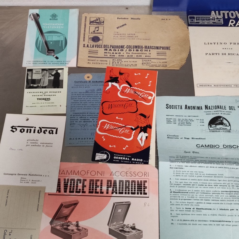 Lotto di 31 cataloghi, listini prezzi, garanzie di radio, dischi, giradischi e apparecchi audio di varie marche tra cui: