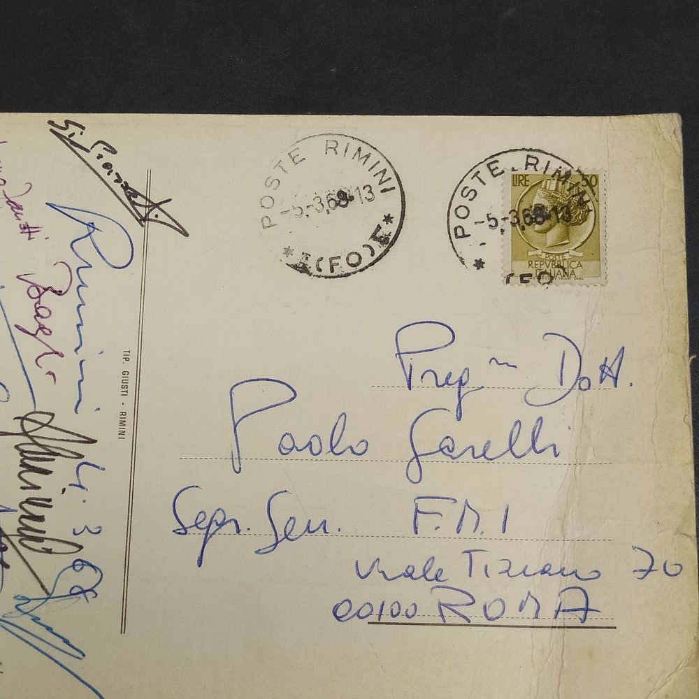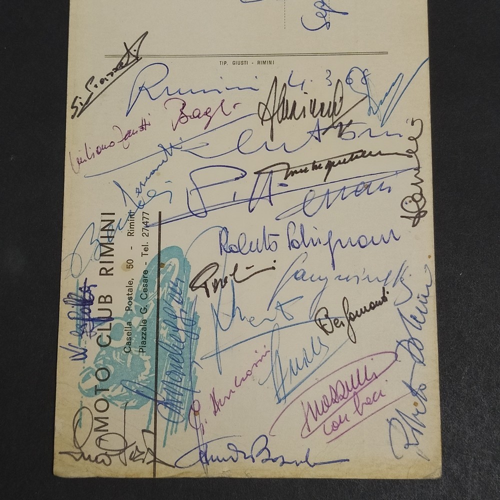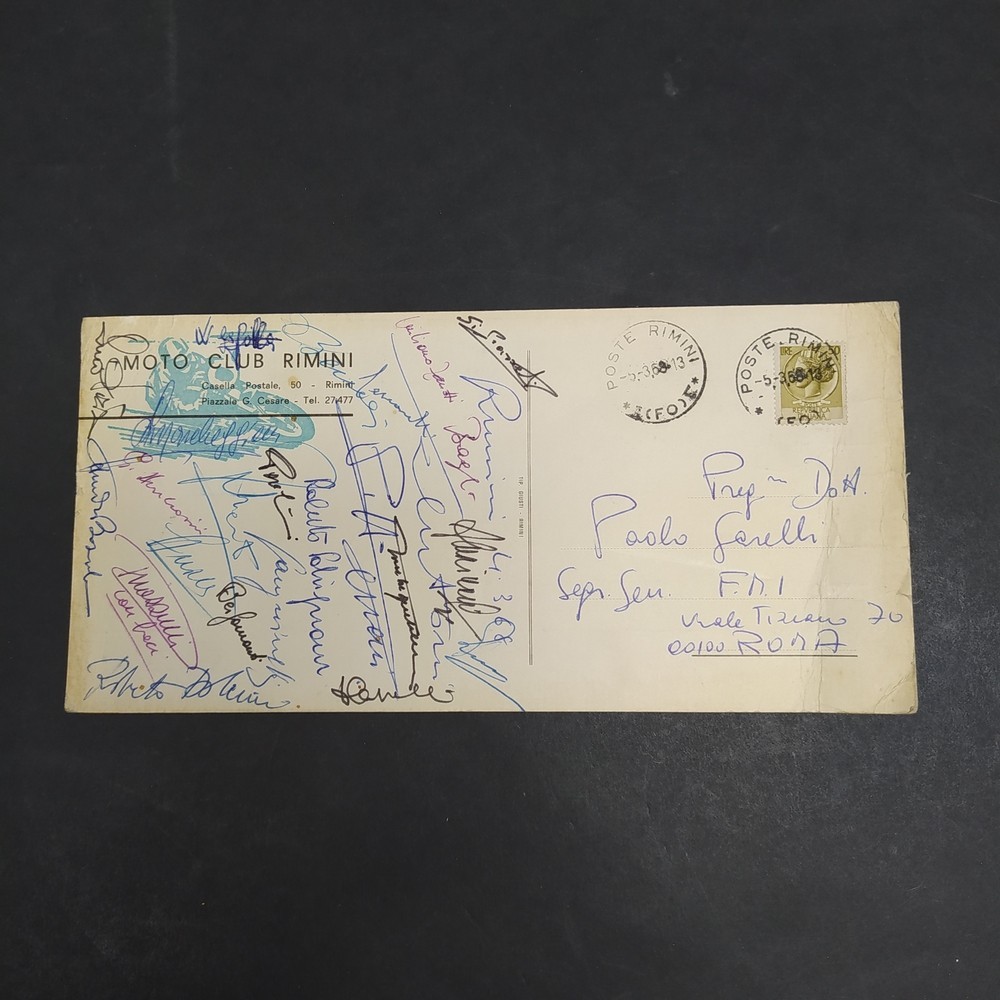 La cartolina ha viaggiato, misura 24x12 cm e sul retro riporta le firme dei partecipanti all'evento. Il destinatario è Paolo Garelli, l'allora Segretario Generale della FMI.