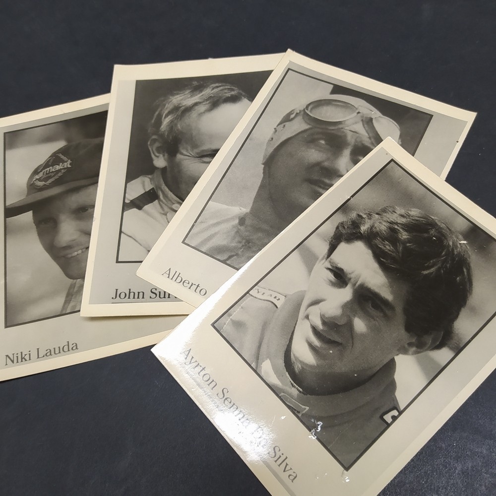 Il lotto include 4 fotografie/cartoline in formato 15x10 cm di piloti di Formula 1. I piloti ritratti sono Niki Lauda, Ayrton Senna Da Silva, Alberto Ascari, John Surtees.