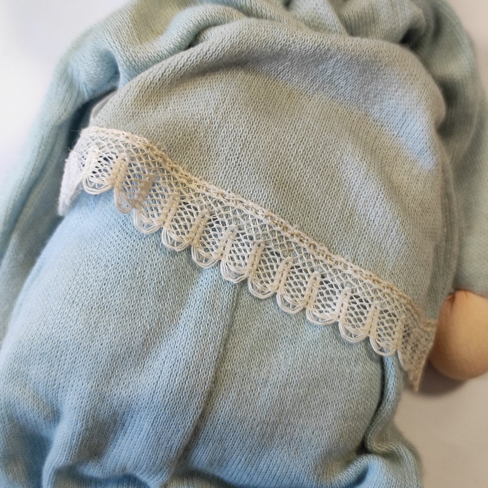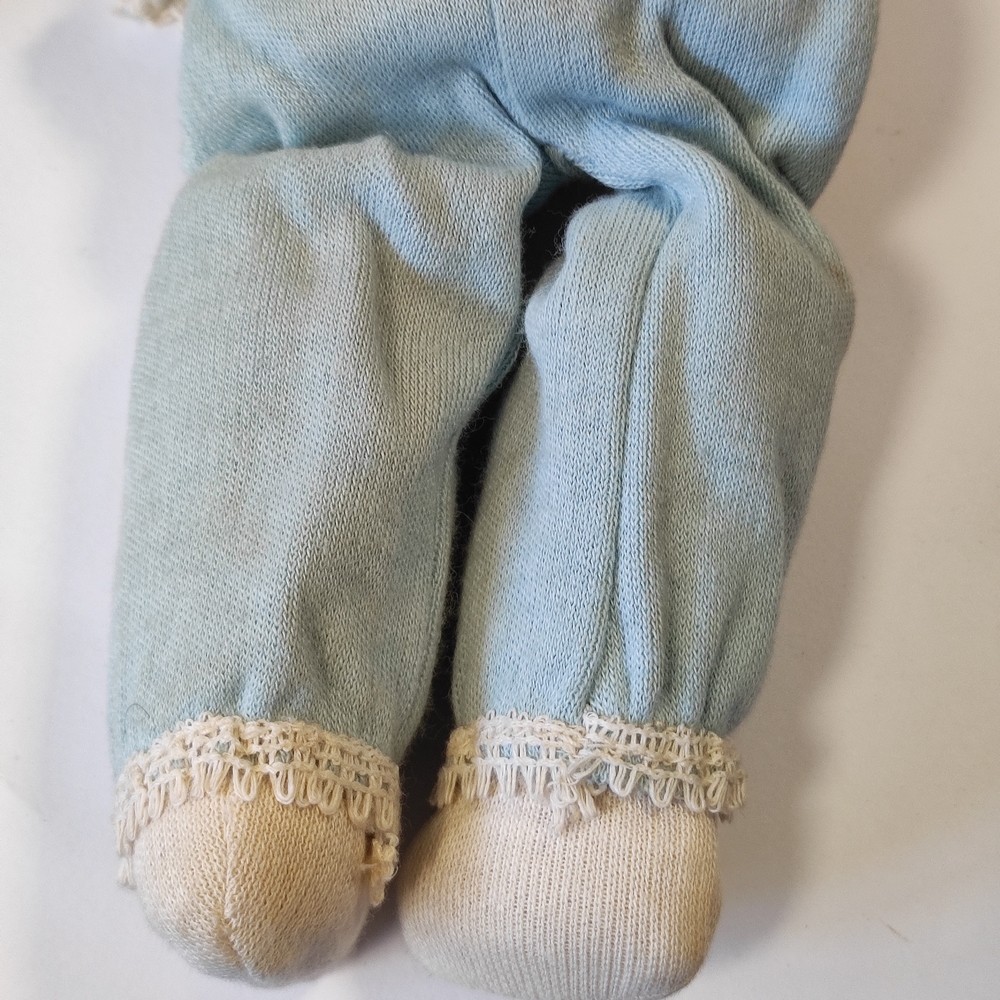 - Il vestitino azzurro presenta delle piccole macchie e un leggero ingiallimento diffuso, si osservano ancora le etichette originali.